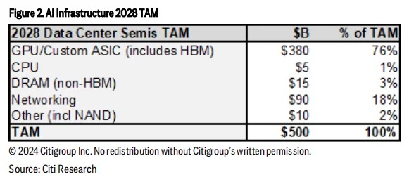 12 月 17 日,花旗分析师 Atif Malik、Papa Sylla 发布报告力挺英伟达,重申“这两种芯片将共存”。花旗预计,到 2028 年,AI 加速器的总市场规模(TAM)将达到 3800 亿美元,其中 AI GPU 将占据主导地位,占据 75%的份额,ASIC 则将仅占 25%。