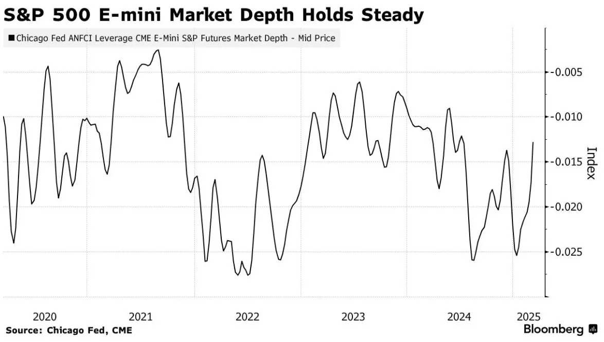 未平仓 VIX 看涨期权与看跌期权的比率已经下降尽管由于看跌期权头寸的负伽马值,交易商对冲调整头寸有时可能增加了一些动力,但关于期权对市场产生过大影响的评论并不多。这主要归因于流动性,根据芝加哥联储和芝商所集团的一项市场深度指标,流动性基本保持稳定。