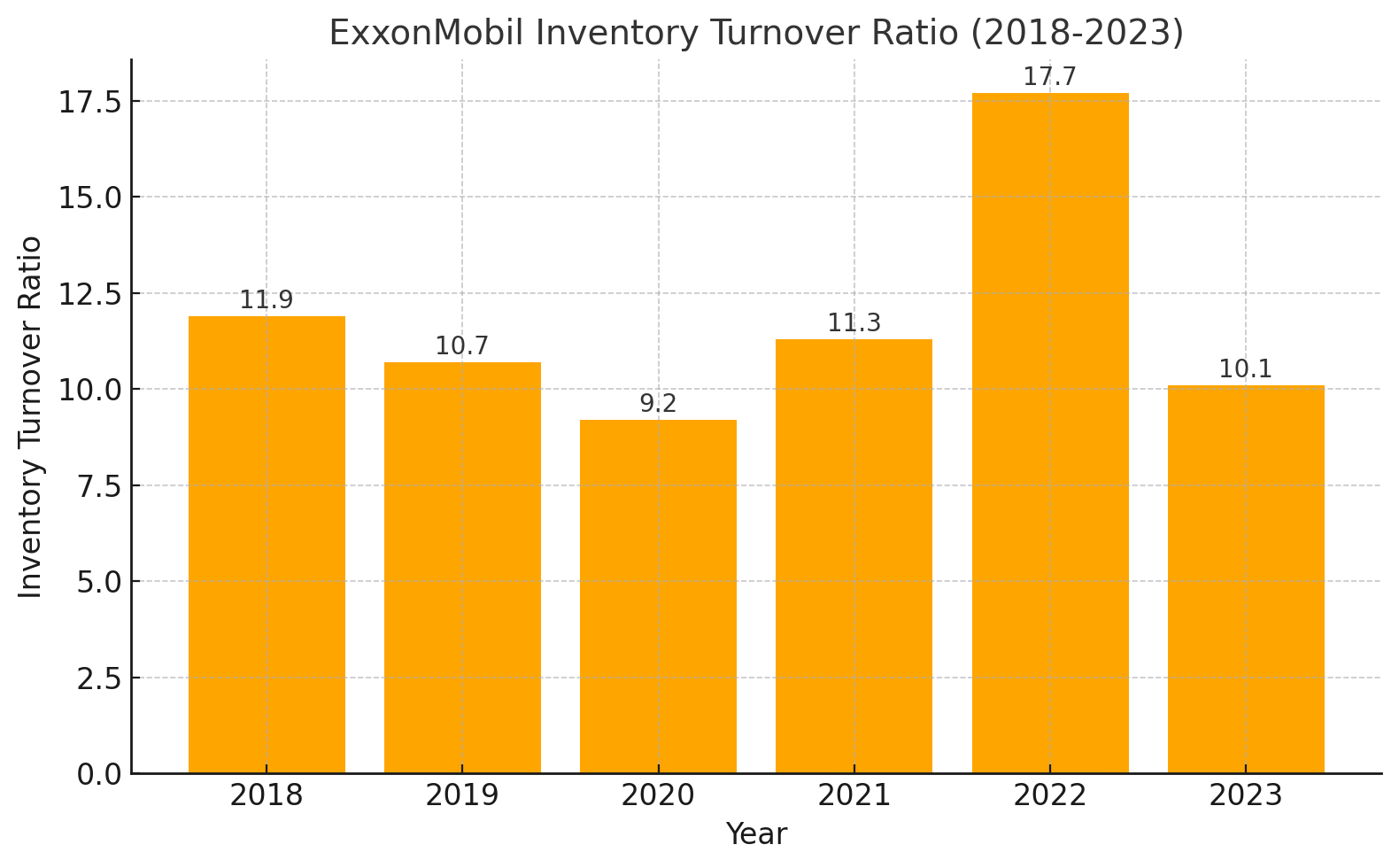 •周期性行业:在这些行业中,存货周转率的变化可以反映经济周期的变化。当存货周转率上升时,可能预示着行业处于上升阶段,而下降的周转率可能预示经济下行。正如下图所示,埃克森美孚(ExxonMobil)的存货周转率在 2022 年达到 17.7 的高点,随后在 2023 年下降至 10.1,表明行业可能处于不同的经济周期阶段。